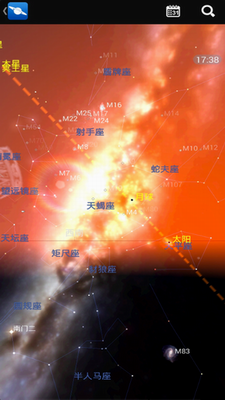 3、注意在地球周围的那些橙色线条,那是所有地球上空人造卫星的轨道,这是一个付费功能,需要花钱才能开通。因为全部天体都是三维渲染的,在这个模式下,你可以通过用手指拖动屏幕来360度旋转画面,以从各个角度观察,还可以用两个手指放大缩小。另外需要提一下,软件中所有天体的相对位置都是实时计算生成的,和当前它们在宇宙中的实际位置完全一致,所以在这个地球的三维图像上北京时间22:44分晨昏线的位置也确实是实际的位置(印度洋以西阿拉伯半岛东端),这让探索过程十分具有真实感。如果你在这个位置缩小画面到一定程度,画面上就能看见月球的轨道;