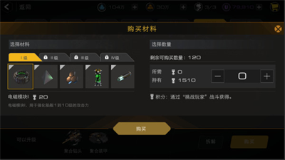 2、仓库消耗军衔积分购买材料。每日挑战玩家最高获5000积分,军衔等级越高,可购材料越多。