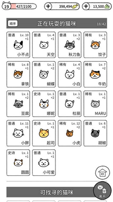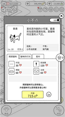 2、猫咪和房屋都能升级,猫咪升级后增加爱心产出,房屋升级则提高资源收益,爱心决定可养猫咪数量,资源用于升级和收集新元素。