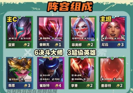 羁绊效果:6决斗大师羁绊显著提升亚索攻击速度与闪避能力,结合3超级英雄羁绊增强全体属性,形成攻防兼备的组合,最大化亚索的持续输出潜力。