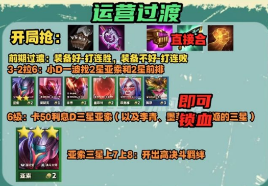 2、3-2回合升至6级,适度搜索获取二星亚索,搭配3超英4决斗羁绊稳定血量,随后利用50金币利息缓慢搜寻三星亚索,逐步强化阵容强度。