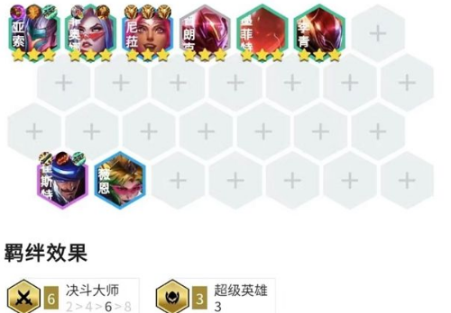 3、亚索达到三星后升级至7或8级,开启6决斗羁绊,完成最终阵容成型,确保团队输出达到顶峰。