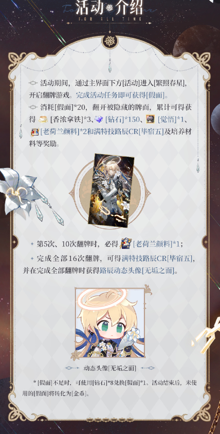 活动正式上线时间为4月11日更新后至4月16日05:00,玩家可通过游戏主界面下方的活动入口进入繁照春星专属页面。在活动期间,您需要完成指定的每日任务或挑战,或者选择购买游戏内提供的限时礼包来获取假面道具。这些假面是参与活动的关键货币,消耗假面后您可以翻开游戏界面中被隐藏的牌面,每次翻开都将随机获得丰厚奖励,包括钻石、觉悟道具、老荷兰颜料以及稀有角色路辰CR毕宿五等。钻石作为通用货币可用于抽取新角色或购买装备,觉悟则能加速角色升级进程,老荷兰颜料则是绘画系统的重要材料,而路辰CR毕宿五作为强力角色,其加入将为您的队伍带来显著战力提升。活动设计注重趣味性与策略性,玩家需合理分配假面资源,优先完成高收益任务以快速积累奖励。通过系统化的参与方式,玩家能在短时间内大幅增强游戏进度,享受沉浸式的冒险乐趣。