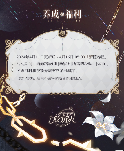 综上所述,时空绘旅人繁照春星活动为玩家带来了一场精彩纷呈的限时盛宴,从假面获取与消耗的核心玩法到路辰CR毕宿五的培养减半福利,每个环节都设计得既简单易上手又富有深度。玩家通过积极参与活动任务,不仅能收获钻石、觉悟和老荷兰颜料等实用道具,还能解锁并强化稀有角色,显著提升游戏整体实力。活动时间有限,建议玩家制定详细计划,优先完成高价值任务以充分利用每一分资源。最终,这一活动将助您在游戏世界中获得更多成就感与乐趣,期待大家共同探索繁照春星的魅力世界。