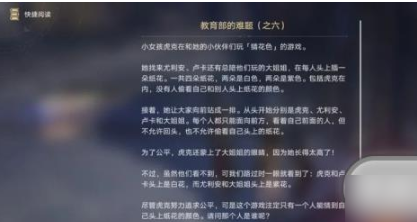 在崩坏星穹铁道的游戏世界中,教育部的难题之六设计了一个有趣的“猜花色”互动场景。故事围绕小女孩虎克展开,她邀请了几位伙伴——包括尤利安、卢卡以及一位经常陪伴他们的大姐姐——共同参与这个智力游戏。虎克精心准备了四朵纸花,其中两朵呈现纯洁的白色,两朵则是神秘的紫色,并将这些花朵随机插在每个人的头上。为了确保游戏的公平性,虎克制定了严格的规则:所有参与者都不能偷看自己或他人头上的花朵颜色。随后,她让大家站成一排,顺序为虎克在最前,其次是尤利安、接着是卢卡,最后是大姐姐。每个人只能面向前方,观察自己前面的人,但严禁回头或试图查看自己的花朵。更特别的是,虎克还贴心地蒙上了大姐姐的眼睛,因为她的身高优势可能影响公平性。有趣的是,作为旁观者,我们一眼就能看到真实的花色分布:虎克和卢卡头上的花朵是白色的,而尤利安和大姐姐头上的则是紫色的。尽管虎克力求公正,但这个游戏的设定决定了只有一个人能够准确推断出自己头上的花朵颜色。经过逻辑推演,最终揭示出那个能猜出答案的人是尤利安。