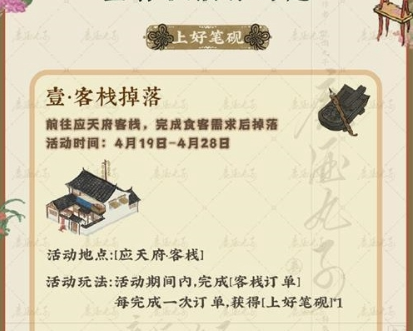 活动核心玩法详解:墨香飘散作诗趣的核心在于材料收集与兑换。首先,玩家需要获取上好笔砚。前往应天府客栈,这里是活动的重要起点。在客栈中,玩家需完成食客提出的各种需求订单,每成功完成一次订单,即可获得上好笔砚一枚。这一过程模拟了古代文人的日常,玩家在满足食客的同时,积累创作工具,为后续步骤打下基础。客栈订单设计多样,包括食材收集或任务解决,玩家可通过合理安排时间高效完成。
