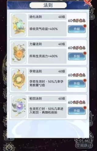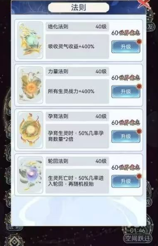 资源运转遵循五行相生之理:护山大阵与天地灵气互为表里,精粹能量驱动秘法威能,神火淬炼强者肉身,灵植种子促进人口繁盛。尤其天地法则的领悟,将同时提升灵气浓度、族群战力与文明规模,形成环环相扣的发展闭环。
